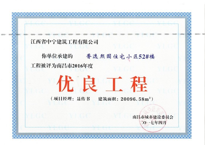 本報訊 由我公司承建的江西省南昌市灣里區香逸熙園住宅小區項目51#樓、52#樓、55#樓,被評為南昌市2016年度“優良工程”。