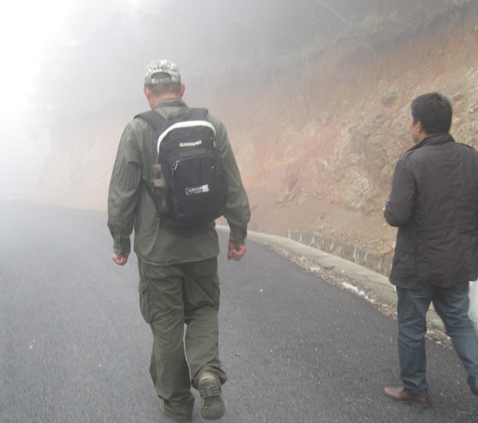 爬山的過程中,我一直都排在隊伍的最后,也是因為這個原因,我也欣賞到了每個隊員不同角度的風彩。在霧中,帶領我們前行的胡董,猶如一位巨人,支撐和引領著我們這個遠行的團隊。似曾相識的巨人,對了,這不是我昨日夢中的巨人嗎?此刻,巨人的肩膀和高高飄揚的中寧旗幟,那夢中的意境浮現眼前。只不過,與夢不同的是,由于領袖的召喚和自己的行動,離巨人的距離更近了一步。