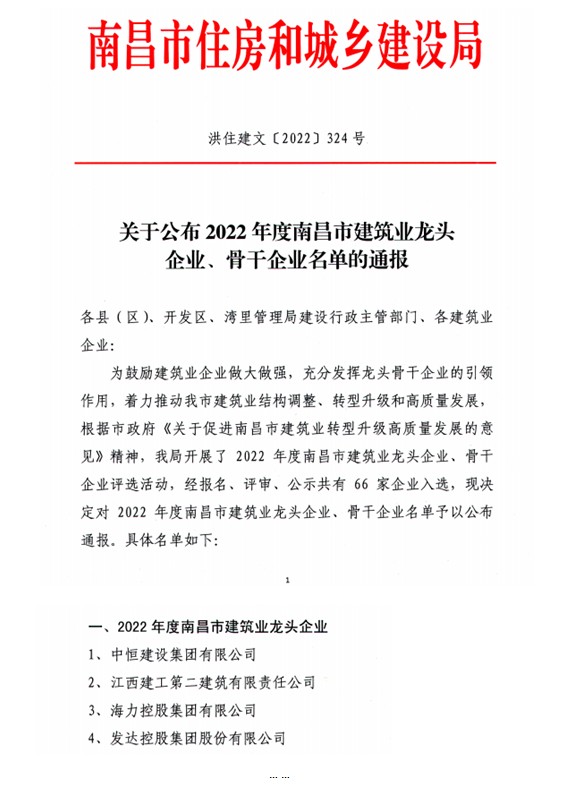 我司榮獲“2022年度南昌市建筑業(yè)骨干企業(yè)”榮譽(yù)稱號